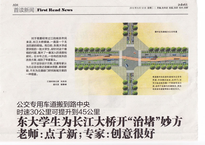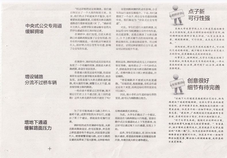 “经过详细的论证和调查,我们最后制定出了一个大致的制堵方案。其实,我们的点子听起来并不复杂,也不需要拓宽道路宽度,只需将大桥北路的道路进行重新规划就OK了。”调研项目主持人,bat365中文官方网站交通运输专业的大四学生郝威告诉江南时报记者。