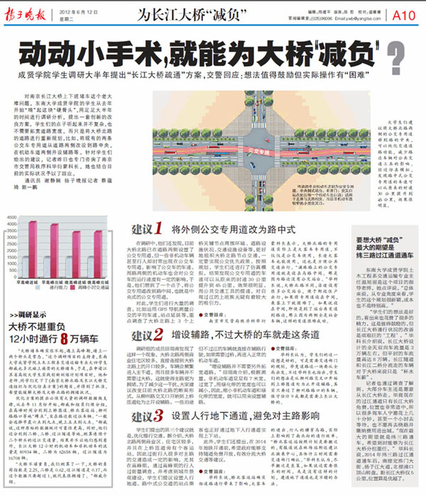 对南京长江大桥上下班堵车这个老大难问题,bat365中文官方网站的学生从去年开始“啃”起这块“硬骨头”,用足足大半年的时间进行调研分析,提出一套创新的改良方案。学生们的点子听起来并不复杂,也不需要拓宽道路宽度,而只是将大桥北路的道路进行重新规划,比如,将现有的两条公交车专用道从道路两侧改设到路中央,在机动车道两侧开设辅路等。针对学生们给出的建议,记者昨日也专门咨询了南京市交管局秩序科毕衍蒙科长,她也结合目前的实际状况予以了回应。