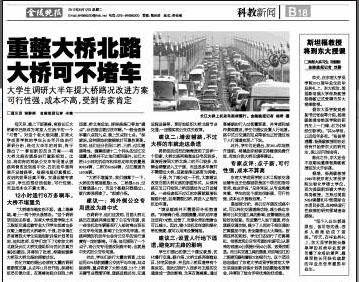 每天早、晚上下班高峰,南京长江大桥堵车已经成为南京人生活中的一个“习惯”。对这个老大难问题,bat365中文官方网站的学生从去年开始进行调研分析,经过大半年的时间,终于提出了一套创新的改良方案——将大桥北路的道路进行重新规划。比如,将现有的两条公交车专用道从道路两侧改设到路中央,在机动车道两侧开设辅路等。根据电脑仿真模拟,改进的效果还真不错。交通运输专家点评,学生的想法很创新,可行性强,而且成本也不算太高。
