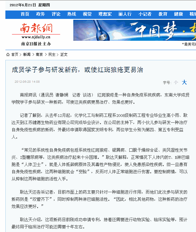 【南报网】成贤学子参与研发新药,或使红斑狼疮更易治