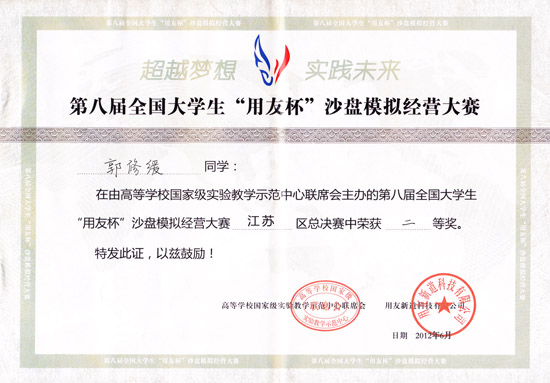 2012全国第八届大学生“用友杯”沙盘大赛获奖证书