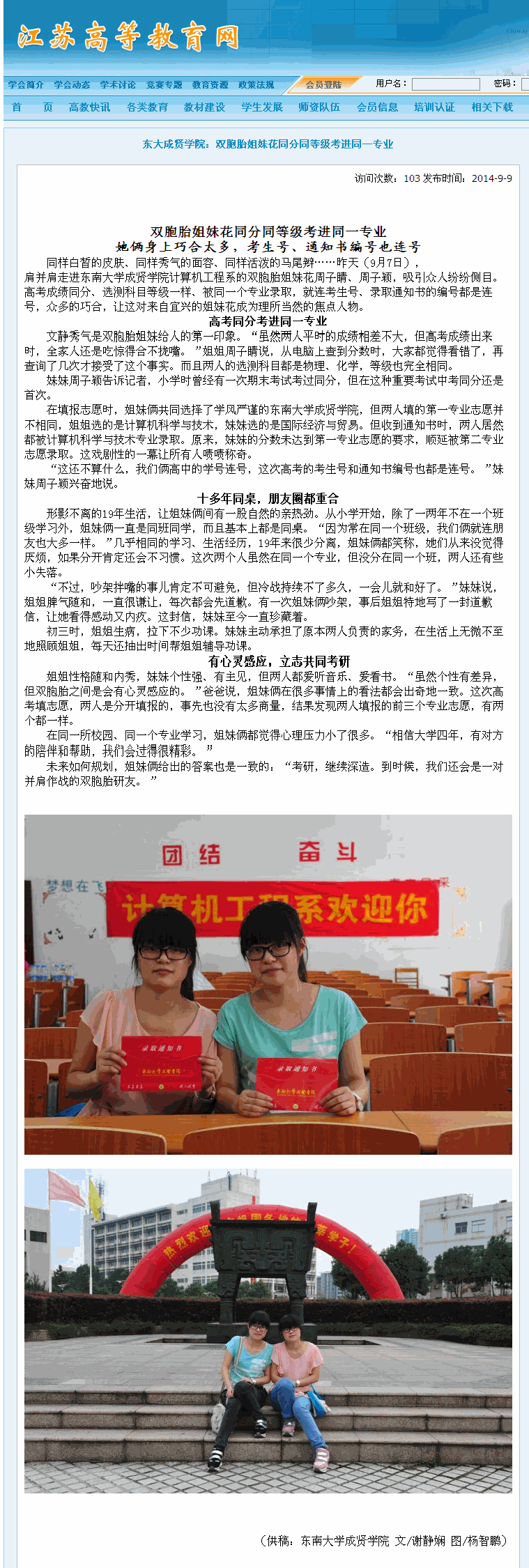 【江苏高等教育网】东大bat365中文官方网站:双胞胎姐妹花同分同等级考进同一专业
