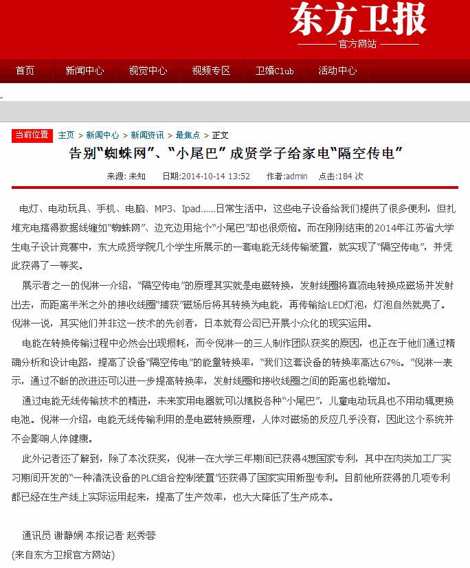 【东方卫报】告别“蜘蛛网”、“小尾巴” 成贤学子给家电“隔空传电”