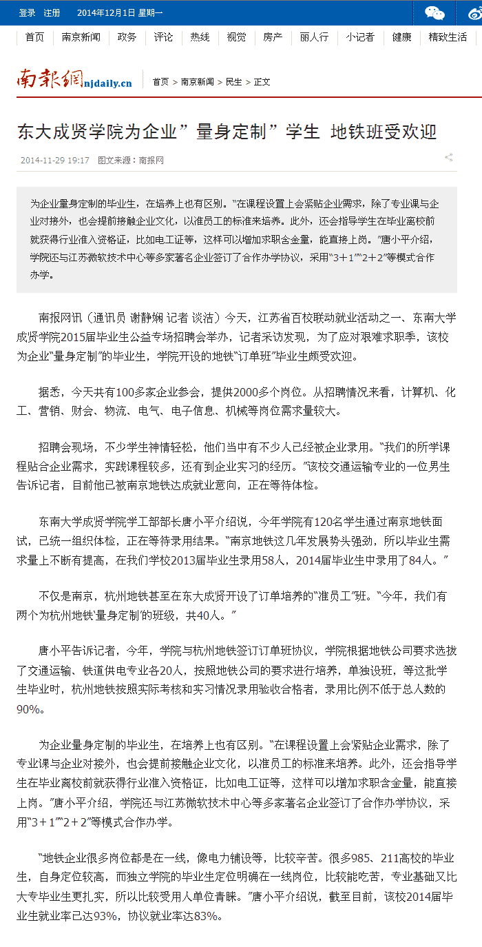 【南京日报】东大bat365中文官方网站为企业”量身定制”学生 地铁班受欢迎