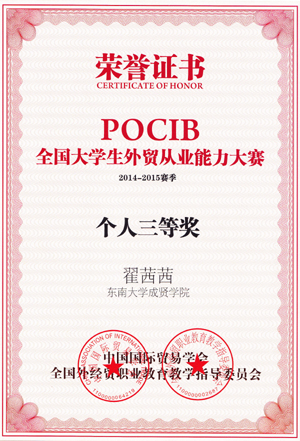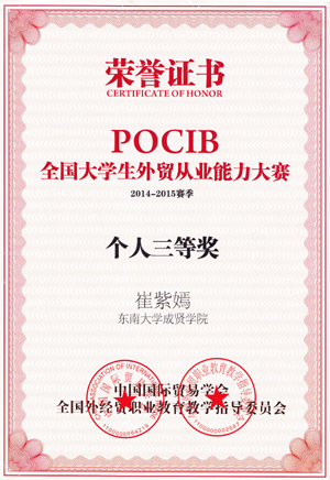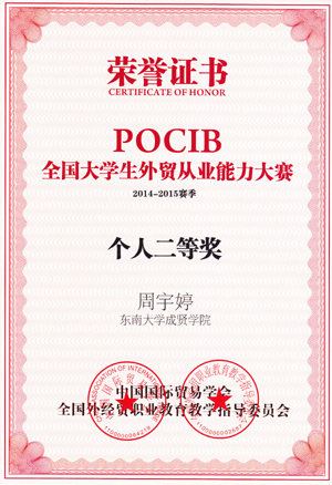 2015年4月29日,由商务部中国国际贸易学会和全国外经贸职业教育教学指导委员会主办的第四届“POCIB全国大学生外贸从业能力大赛”落下帷幕。经济管理系青年教师戴竹青和包小妹带领国贸、物流专业20名同学进行跨专业团队协作。我院参赛队凭借出色发挥赢得了团体三等奖,其中周宇婷同学荣获个人二等奖,崔紫嫣、翟茜茜同学均获个人三等奖。