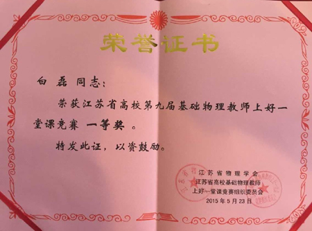 5月23日至24日,江苏省高校第九届基础物理教师上好一堂课竞赛在常州大学举行。我院基础部物理组青年教师白磊参加此次讲课竞赛,并取得一等奖的优异成绩。