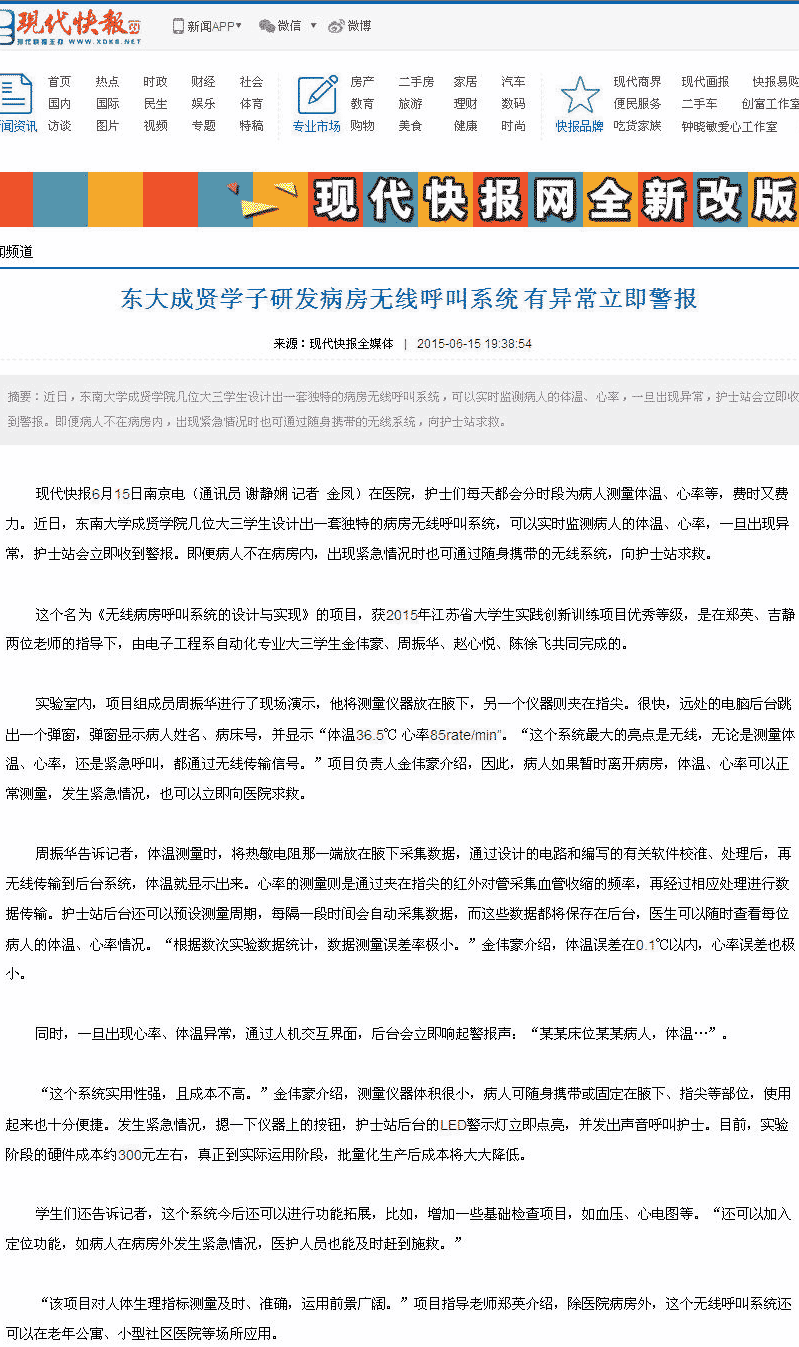 【现代快报】东大成贤学子研发病房无线呼叫系统 有异常立即警报