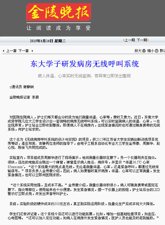 【金陵晚报】东大学子研发病房无线呼叫系统