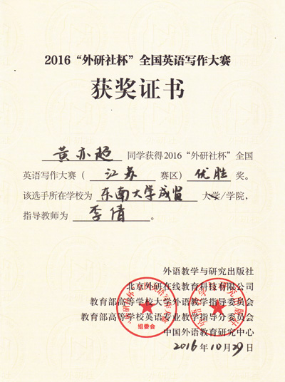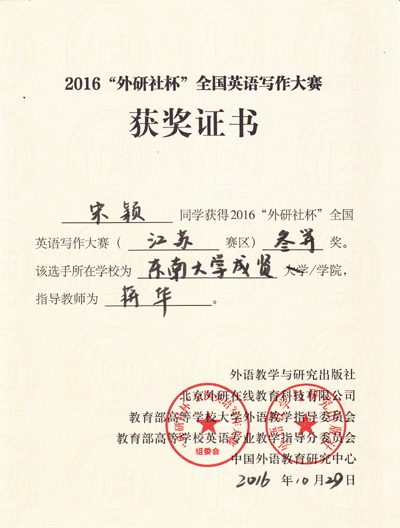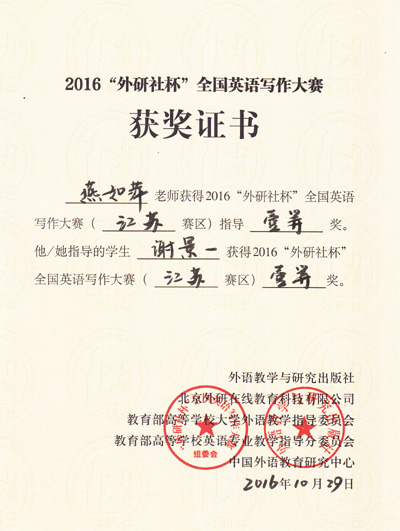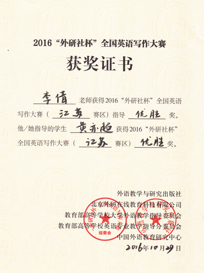 2016.11,我校参加“外研社杯”全国英语写作大赛江苏省复赛获佳绩