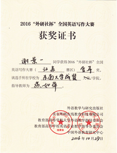 2016年“外研社杯”全国英语写作大赛江苏省赛区复赛于10月29日在南京林业大学圆满落下帷幕。我校基础部英语教师燕如萍指导的2015级电子信息专业谢景一同学在本次比赛中荣获江苏省一等奖,这是目前我校在省级英语比赛中获得的最好成绩。此外,由基础部蒋华老师指导的2015级会计专业宋颖同学获江苏省三等奖,基础部李倩老师指导的2016级会计学专业黄亦超同学获江苏省优胜奖。