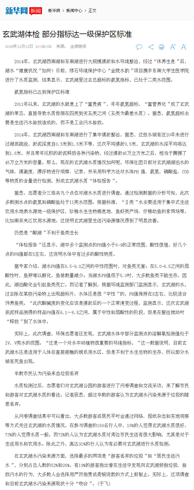 【新华网】玄武湖水质部分指标达一级保护区标准