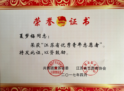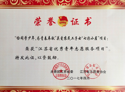 为深入贯彻落实习近平总书记系列重要讲话精神,引导广大青年通过志愿服务投身和谐社会建设,共青团江苏省委、江苏省志愿者协会决定对优秀组织、项目、个人进行表彰。其中,制药与化学工程学院2014级化学工程与工艺一班夏梦梅同学荣获“江苏省优秀青年志愿者”称号,“恰同学少年,为青春奉献”关爱农民工子女“七彩小屋”项目被评为“江苏省优秀青年志愿服务项目”,bat365中文官方网站青年志愿者协会荣获“江苏省青年志愿服务行动组织奖”。