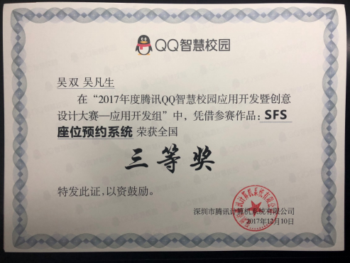 近日,以“智慧未来,无界连接”为主题的QQ智慧校园颁奖盛典在深圳举行,我校电子与计算机工程学院计算机科学与技术专业吴双同学受邀参加了颁奖典礼。吴双同学的“SFS座位预约系统”从全国近200多所参赛高校中脱颖而出,最终取得2017年腾讯QQ智慧校园应用开发暨创意设计大赛应用开发组三等奖的好成绩。