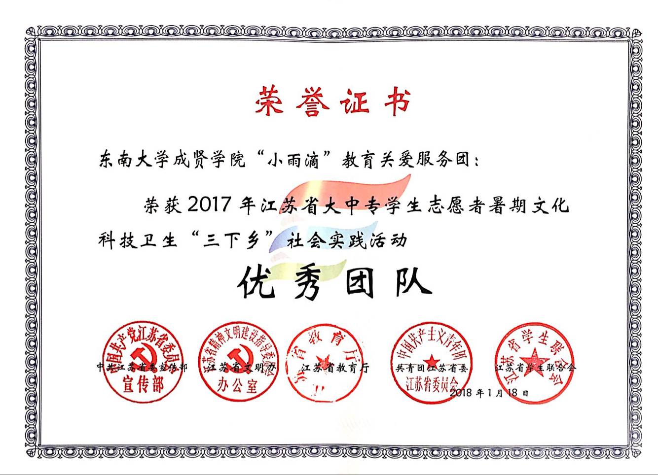 “小雨滴”团队获评优秀团队荣誉证书