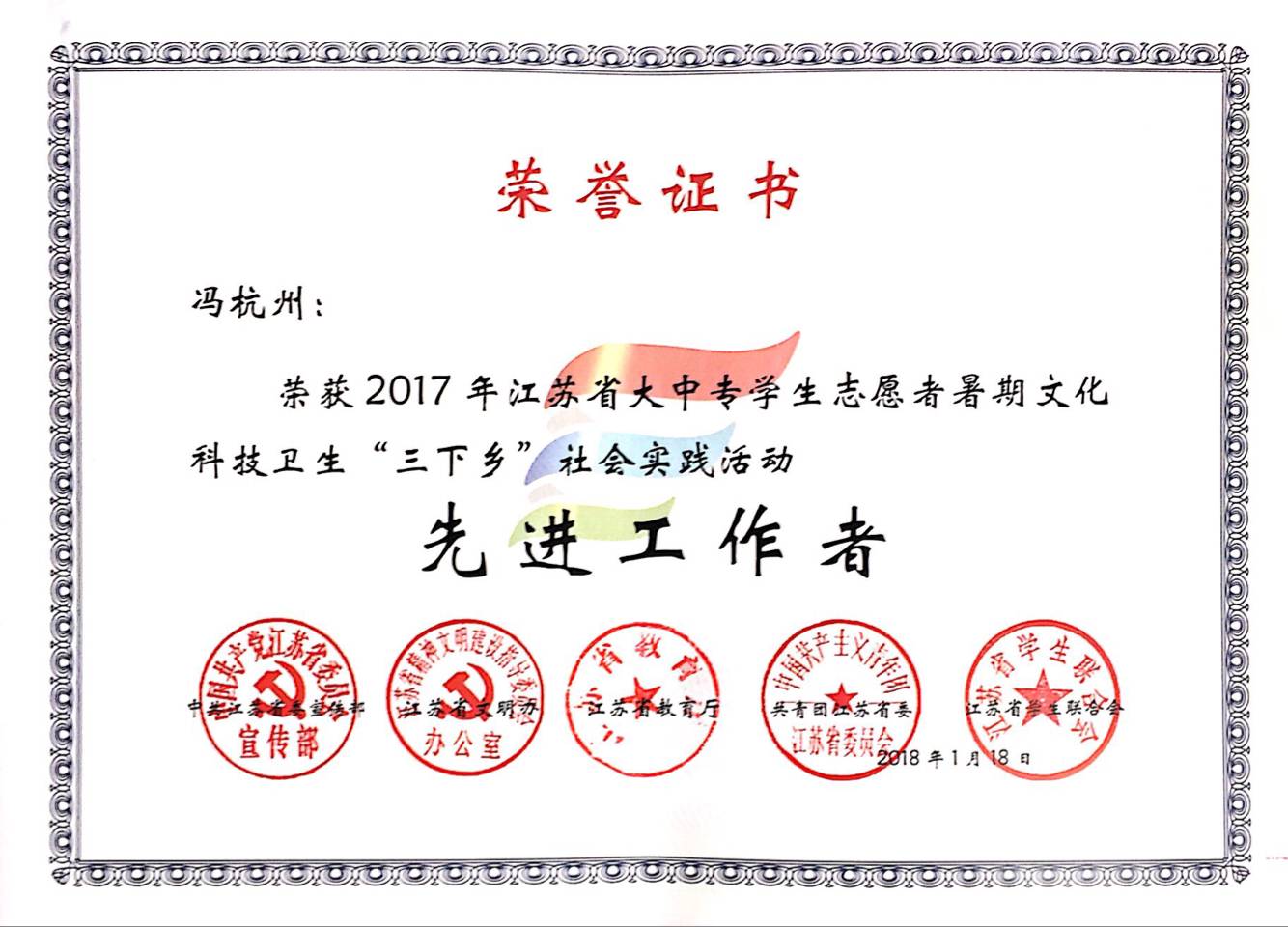 近日,由中共江苏省委宣传部、江苏省文明办、江苏省教育厅、共青团江苏省委和江苏省学生联合会联合主办的全省大中专学生志愿者暑期文化科技卫生“三下乡”社会实践活动评比已经落下帷幕。我校团委志工部“小雨滴”教育关爱服务团获评2017年江苏省暑期“三下乡”社会实践活动“优秀团队”。此外,校团委冯杭州老师被评为2017 年江苏省暑期“三下乡”社会实践活动“先进工作者”。