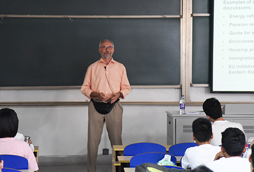 会谈结束后,吕克尔博士在华罗庚馆202教室给学生们用英语作了一场题为“德国——中欧和欧盟的中流砥柱”的讲座。讲座介绍了1990年后,德国所担当的角色,涉及政治结构、经济实力、未来发展的观点。吕克尔博士以详尽的史实、独到的观点,让学生们享受了一场德国政治、经济的大餐。