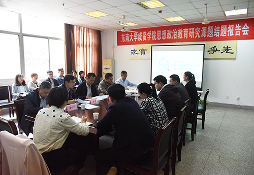 10月17日下午,我校2017年度思想政治教育研究课题结题报告会在实验大楼103会议室召开。会议专程邀请到南京信息工程大学数学与统计学院党委副书记徐锋华,校党委书记徐悦,党委副书记、副院长王荣,高建国教授,学生处处长唐小平共同担任评委,各课题组老师和全体青年辅导员共同参加报告会。