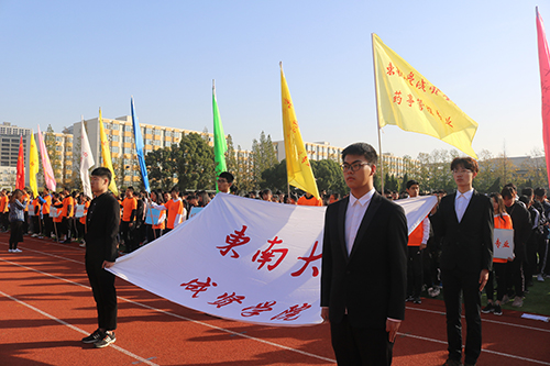 参赛代表队在运动会进行曲中迈着整齐的步伐依次入场。徐悦书记首先致辞,代表学校党政领导向参加本届运动会的全体师生表示诚挚的问候,并对本次运动会提出希望和要求。随后选出体育运动活动中表现突出的运动员作为“十佳运动员”进行表彰,他们分别是刘梓恒、唐红、范志辉、刘永沛、章宸瑄、郑颍、盛泽成、岳涛、李宛林、杨婷;对在2018年江苏省大学生校园篮球联赛(独立学院组)比赛中获得冠军队伍代表进行表彰,他们分别是岳涛、吴雨聪、余盛强、路志鑫、盛泽成、冯帆;对被评选为学校“体育工作积极分子”的六名教师进行表彰,他们分别是冯杭州、庄桂山、李洪全、肖佩琮、朱龙舜、李皓。随后15级汽车2班吴肇章同学与体育部徐小虎老师分别代表运动员和裁判员郑重宣誓。最后由bat365中文官方网站体育系王强书记宣布运动会开幕。