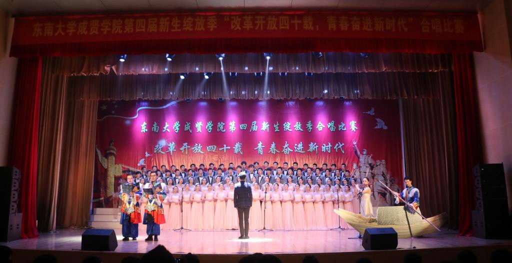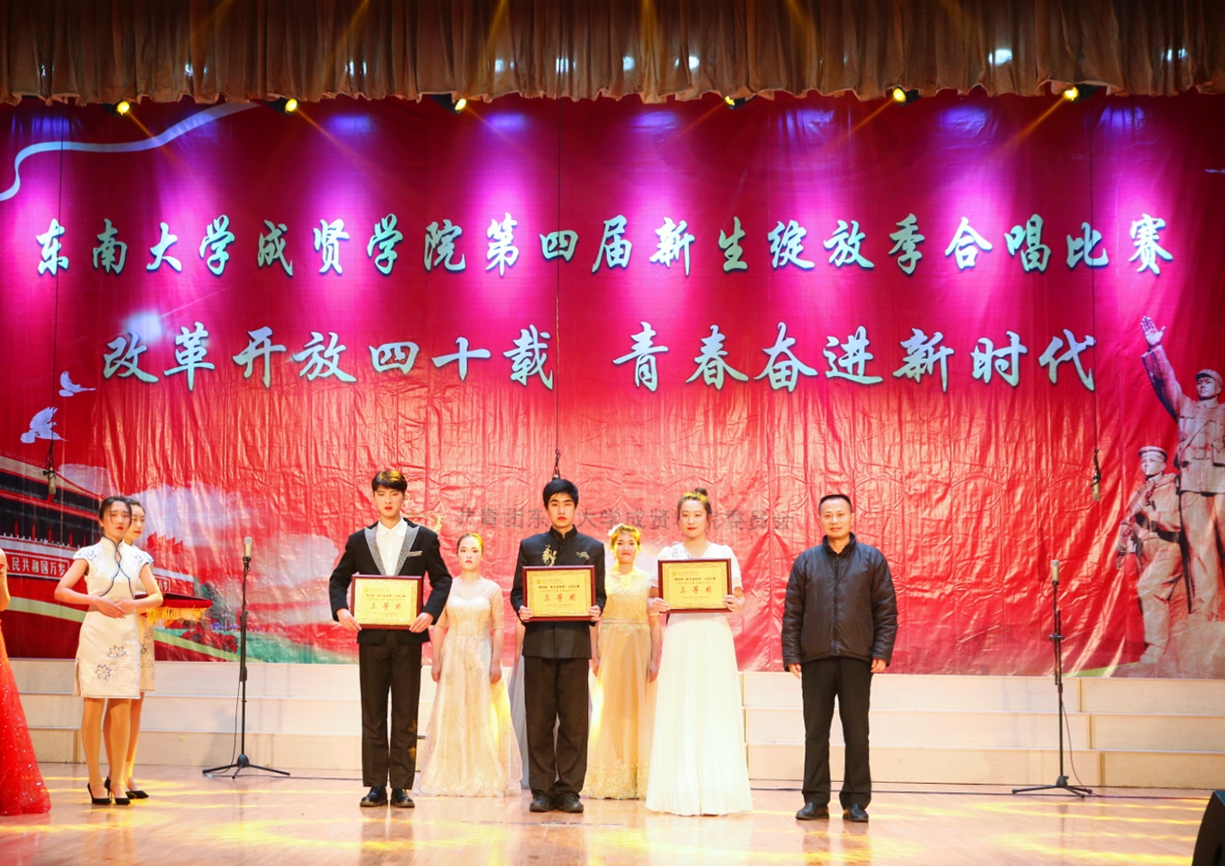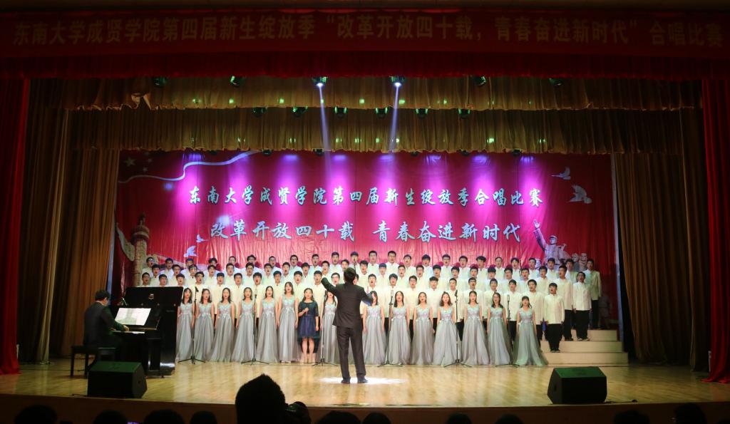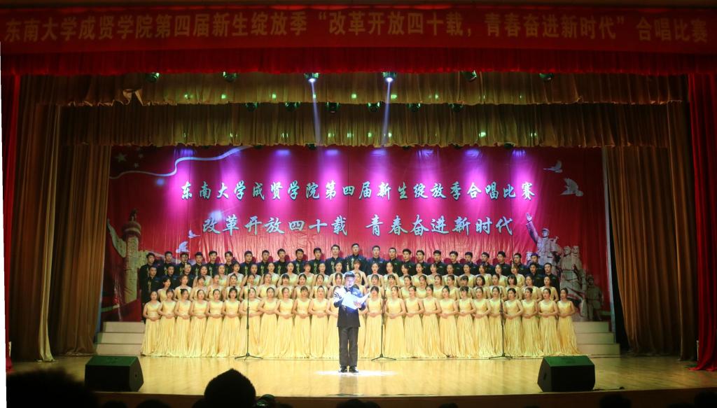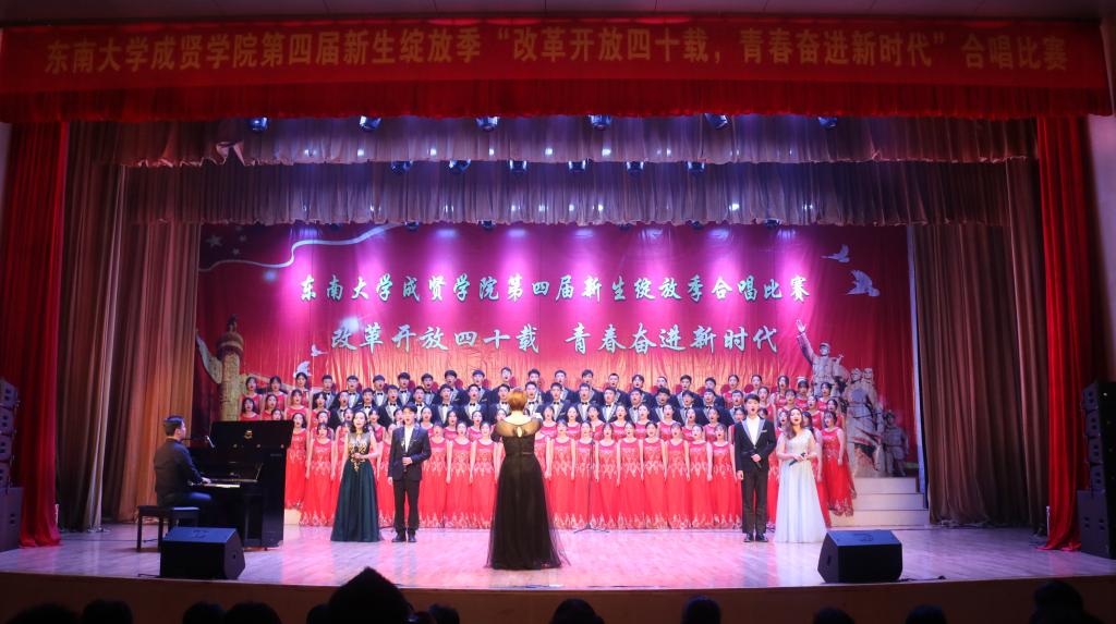 比赛中,大学生艺术指导中心音乐团倾情演绎歌曲《望春风》,展现了经典民谣的优美旋律;各学院老师积极参与指导与演出,师生们通力合作,用铿锵有力、激昂向上的歌声引发了观众对改革开放四十周年来伟大变革的共鸣,充分表达出成贤学子更加坚定走中国特色社会主义道路、改革开放道路的信心与决心。比赛在全场齐唱雄壮的《bat365中文官方网站校歌》声中圆满结束。