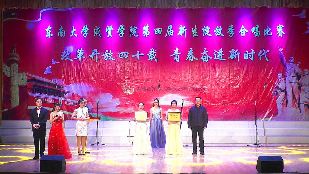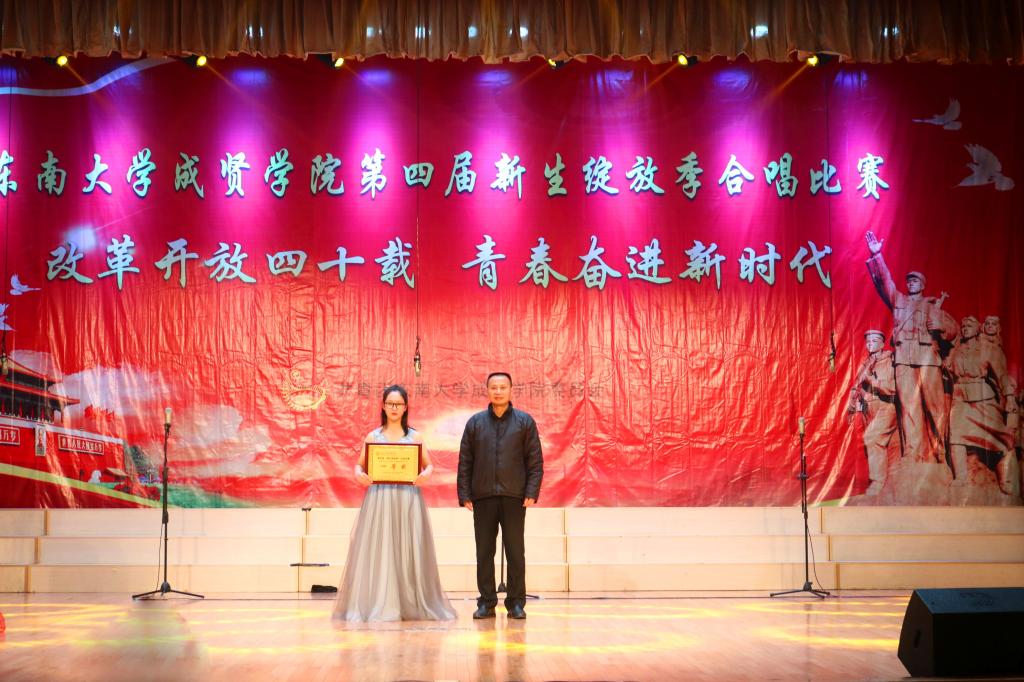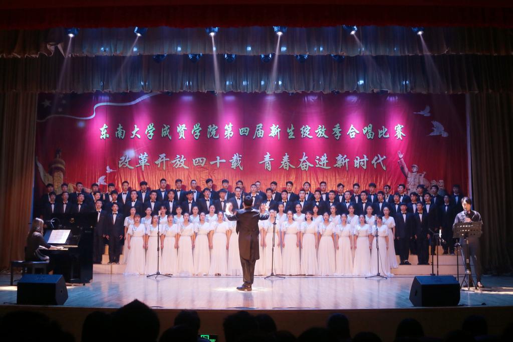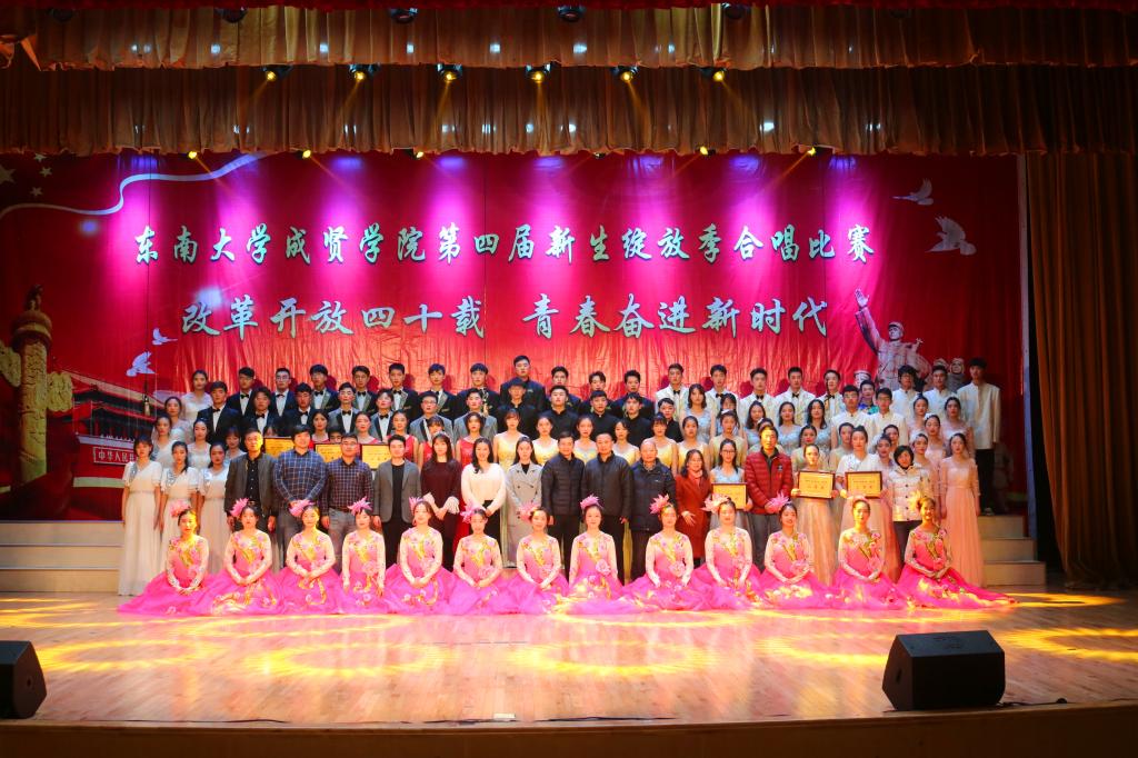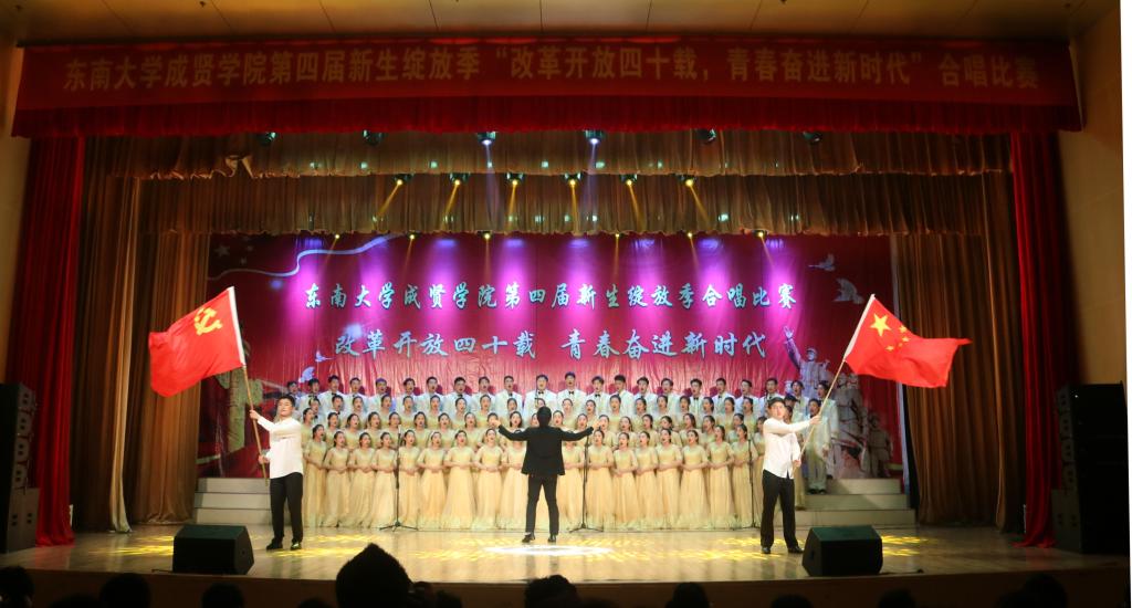 比赛中,大学生艺术指导中心音乐团倾情演绎歌曲《望春风》,展现了经典民谣的优美旋律;各学院老师积极参与指导与演出,师生们通力合作,用铿锵有力、激昂向上的歌声引发了观众对改革开放四十周年来伟大变革的共鸣,充分表达出成贤学子更加坚定走中国特色社会主义道路、改革开放道路的信心与决心。比赛在全场齐唱雄壮的《bat365中文官方网站校歌》声中圆满结束。