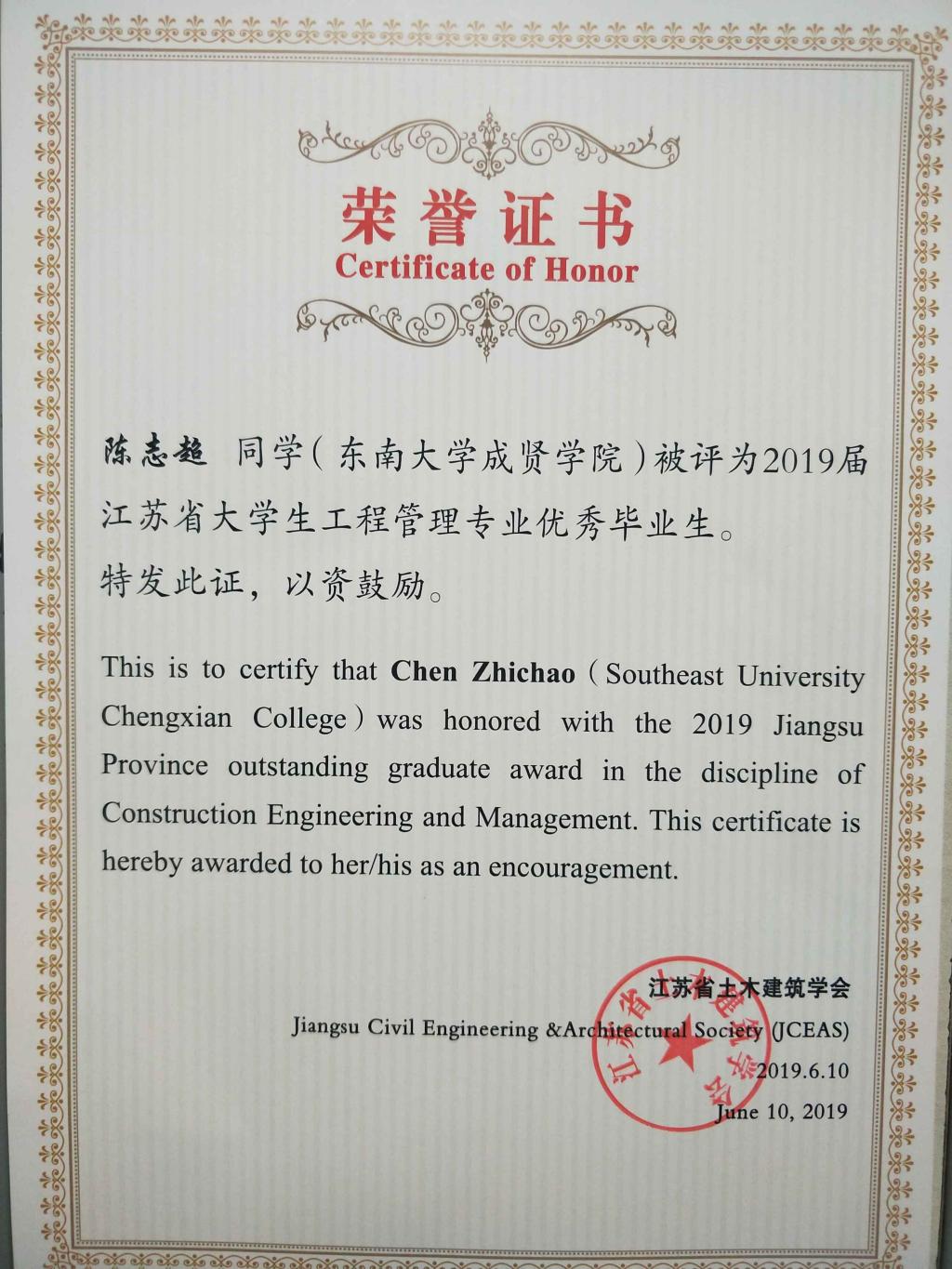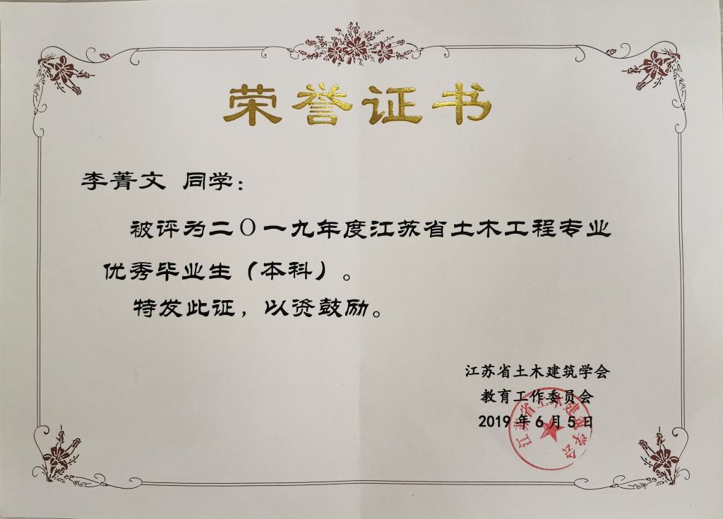 近日,从中国土木工程学会教育工作委员会江苏分会和江苏省土木建筑学会传来喜讯,bat365中文官方网站土木与交通工程学院2019届毕业生李菁文荣获江苏省土木工程专业优秀毕业生,陈志超荣获江苏省工程管理专业优秀毕业生。