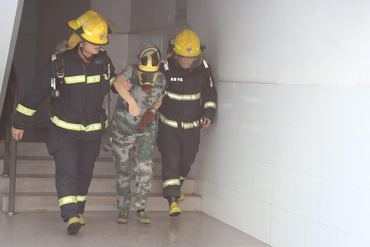 随后的疏散演练现场,学生在宿舍楼突然发生“火灾”的情况下,在第一时间赶赴现场的引导员的指引下,有序地疏散至室外平台区域。在清点人员后,消防员模拟进入建筑物营救被困人员,最终全部人员安全疏散完毕,整场活动井然有序。