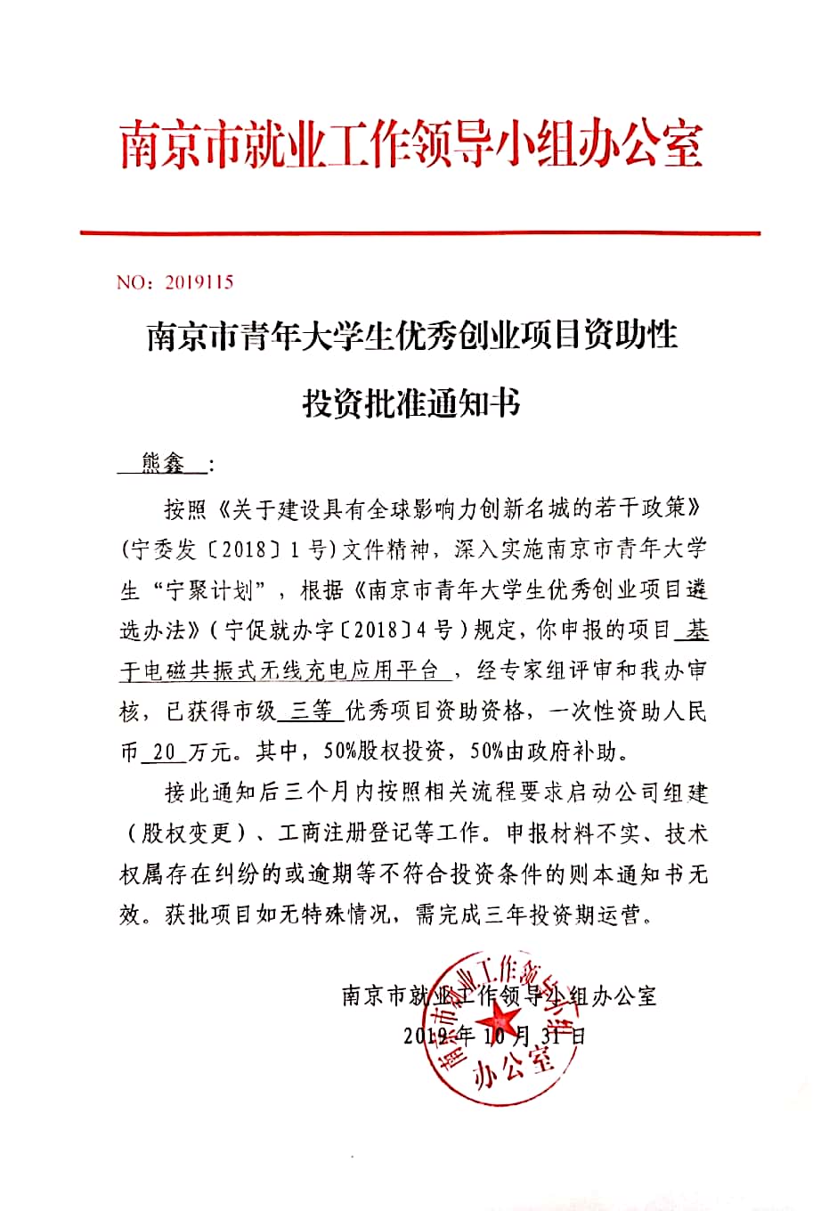 在2019年南京市大学生优秀创业项目遴选中,bat365中文官方网站2016级计算机科学与技术专业熊鑫同学带领的创业团队项目《基于电磁共振式无线充电应用平台》获得三等优秀项目资助资格,获政府一次性资助20万。
