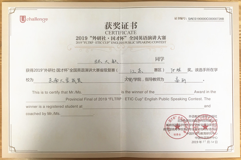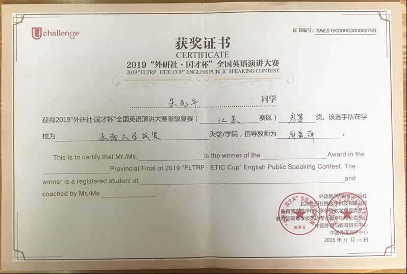 来自约70所本科院校166名学生参加江苏赛区高难度的演讲大赛,2018级计算机4班朱光年(指导老师:周爱萍)获得三等奖,这是我校在省级该类比赛中获得的最好成绩;2016级风景园林2班林大敏(指导老师:姜丽)获优胜奖。