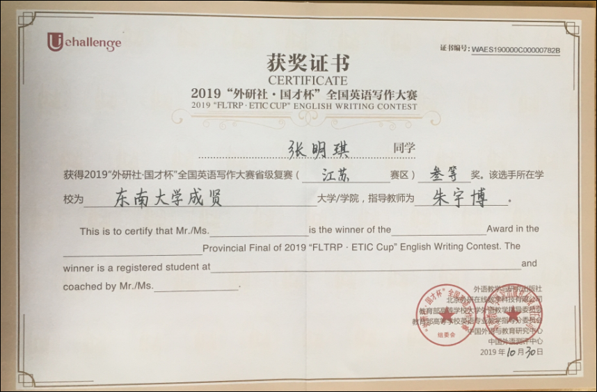 江苏赛区写作大赛共有74所本科院校共226名选手参赛,2017级建筑工程1班孟奕飞(指导老师:朱宇博)获二等奖,在全省二等奖选手中名列第二;2019级会计7班倪雯静(指导老师:蒋华)获二等奖;2017级会计2班张明琪(指导老师:朱宇博)获三等奖。