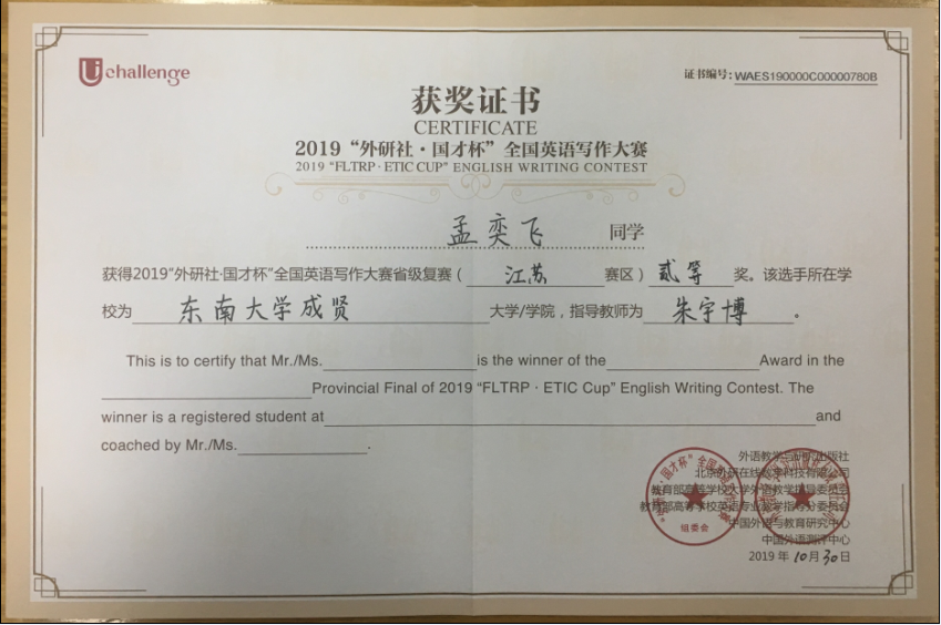 “外研社•国才杯”全国大学生英语挑战赛由外语教学与研究出版社、教育部高等学校大学外语教学指导委员会、教育部高等学校英语专业教学指导分委员会和中国外语教育研究中心联合举办,是为全国大学生打造的展现风采、实现自我的大型赛事平台。我校参赛学生在基础部英语教师们的悉心指导下从容应对、发挥出色,取得了骄人的成绩,展现了bat365中文官方网站大学生的风采与实力。