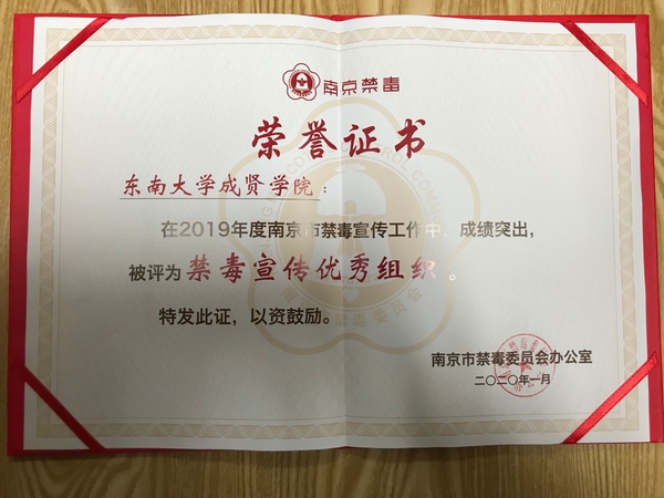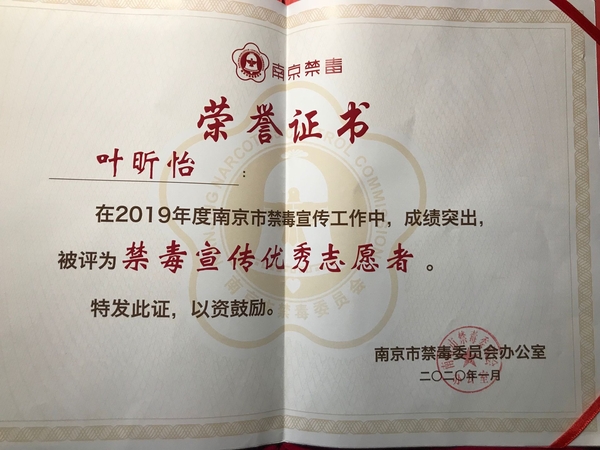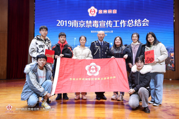 2020年1月5日,2019南京禁毒宣传工作总结会在南京师范大学仙林校区音乐厅召开。省禁毒办常务副主任、省公安厅禁毒总队总队长张波,市局党委委员、市禁毒委副主任曹存福,市禁毒办副主任、市公安局禁毒支队支队长仲军,市教育局宣传与德育工作处处长完进、市公安局禁毒支队副支队长刘庆峰、团市委副调研员陶涛以及各地区高校禁毒志愿者们参加了本次禁毒宣传工作总结表彰会。bat365中文官方网站青年志愿者协会因2019年在禁毒宣传工作上表现突出,被评为“禁毒宣传优秀组织”,我校叶昕怡同学被评为“优秀志愿者”。