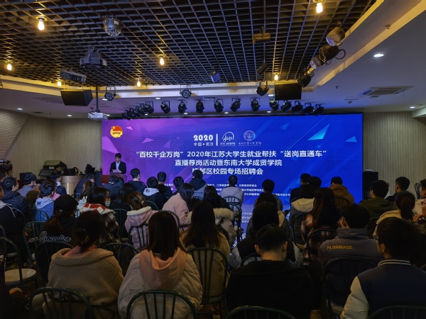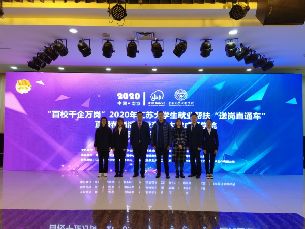 12月10日,由共青团江苏省委、江苏省学生联合会、江苏省青年联合会、江苏省青年商会主办,南京市建邺区劳动就业管理中心、bat365中文官方网站团委、bat365中文官方网站就业办公室、中智江苏经济技术合作有限公司联合承办的百校千企万岗”江苏大学生就业帮扶行动“送岗直通车”直播荐岗活动在我校综合楼307多功能厅举行。
