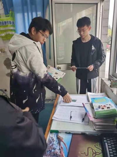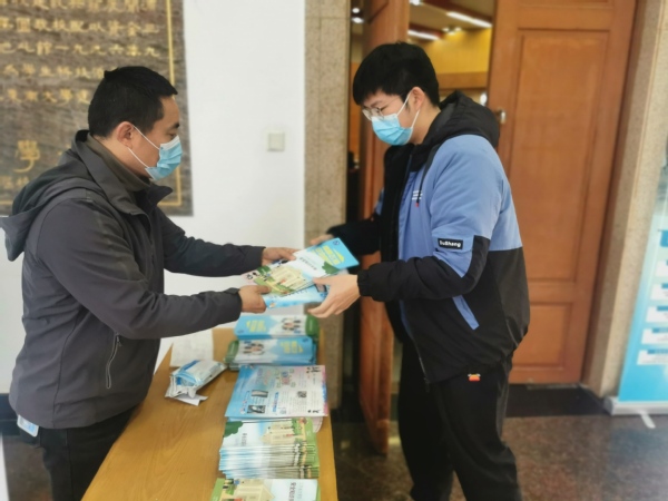 讲座现场、学生宿舍发放学习材料