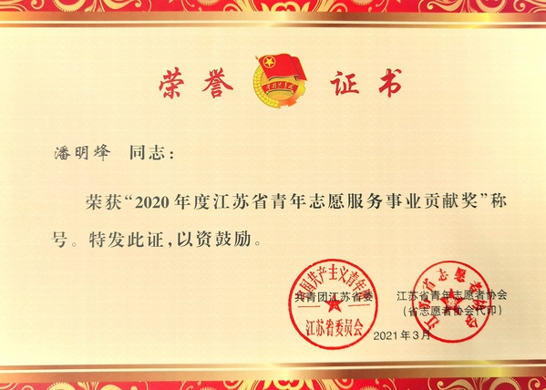 bat365中文官方网站团委书记潘明烽获“2020年度江苏省青年志愿服务事业贡献奖”荣誉称号