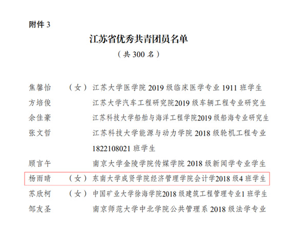 近日,共青团江苏省委下发了《关于表彰2020年度“江苏省优秀共青团员”“江苏省优秀共青团干部”“江苏省五四红旗团委(团支部)”的决定》,我校经济管理学院18级会计4班的杨雨晴同学获评2020年度“江苏省优秀共青团员”称号。
