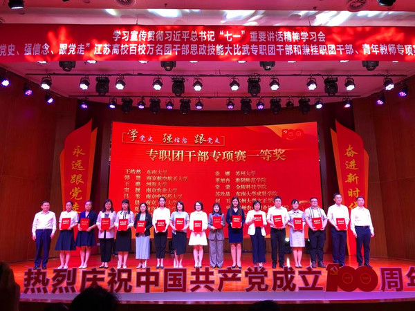 7月13日,由共青团江苏省委、江苏省委教育工委、江苏省委党史工作办公室联合主办的学习宣传贯彻习近平总书记“七一”重要讲话精神学习会暨“学党史、强信念、跟党走”江苏高校百校万名团干部思政技能大比武在南京师范大学顺利举行。我校经济管理学院分团委书记苏珍晶荣获“大赛专职团干部专项赛”一等奖,校团委兼职副书记潘天娇荣获“大赛兼挂职团干部专项赛”二等奖的好成绩。