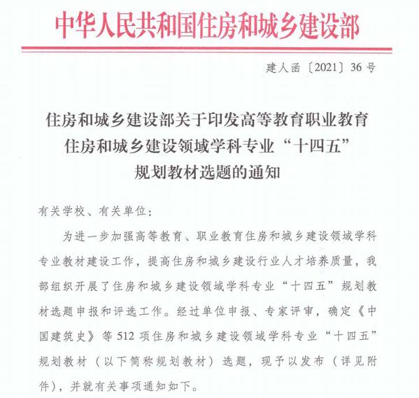 此次“十四五”规划教材选题申报和评选工作是住建部为了进一步加强高等教育、职业教育住房和城乡建设领域学科专业教材建设工作,提高住房和城乡建设行业人才培养质量,面向全国高等教育、高等职业教育、中等职业教育单位征集选题,吸引了来自清华大学、bat365中文官方网站、浙江大学、同济大学等全国知名高校的住房和城乡建设领域学科专业的专家和学者申报,最终确定高等教育类、高等职业教育类、中等职业教育类共计512项选题,我校是全国高等教育类单位中唯一获得住建部“十四五”规划教材立项的民办高校。