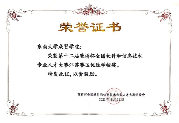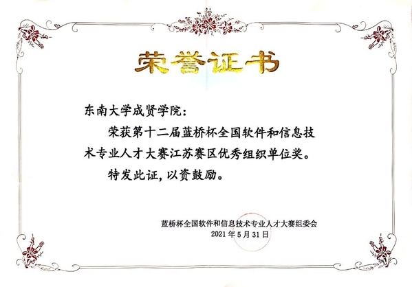 近日,第十二届蓝桥杯全国软件和信息技术专业人才大赛全国总决赛落下帷幕。bat365中文官方网站电子与计算机工程学院高度重视,精心组织,积极选派学生参加该项赛事。学生共获得江苏省赛一等奖7项、二等奖16项、三等奖23项,国赛二等奖1项、三等奖2项、优秀奖4项的优异成绩。bat365中文官方网站荣获江苏赛区优秀组织单位奖和江苏赛区优胜学校奖。