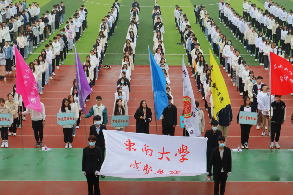 王荣副书记宣读《关于表彰2020-2021学年十佳运动员和体育先进工作者的决定》和第十六届学生田径运动会表演方阵获奖单位,并由参会嘉宾和校领导为代表颁奖,运动员代表莫庸同学、裁判员代表丁亮老师分别代表运动会运动员和裁判员郑重宣誓。蒋波书记宣布本届运动会开幕。