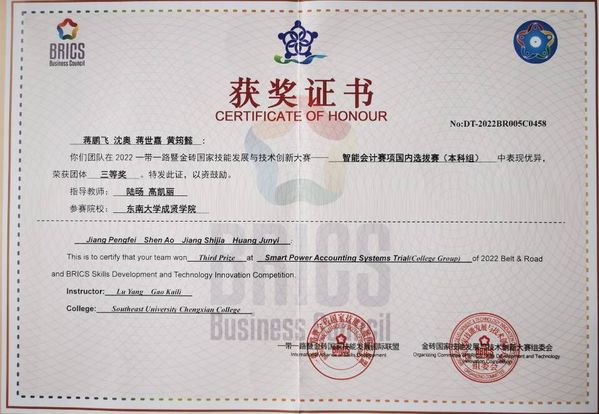 近日,2022一带一路暨金砖国家技能发展与技术创新大赛之智能会计赛项及第五届全国价值创造实战竞赛举办,bat365中文官方网站经管学院会计学、税收学专业蒋鹏飞、沈奥、蒋世嘉、黄筠懿四位同学组队参赛,在陆旸、高凯丽老师的指导下,经过短时间、高强度的团队协作练习,不断总结经验,突破自我,最终斩获全国三等奖的佳绩。