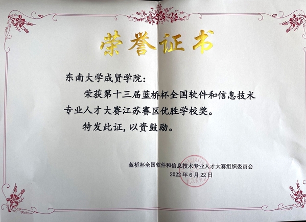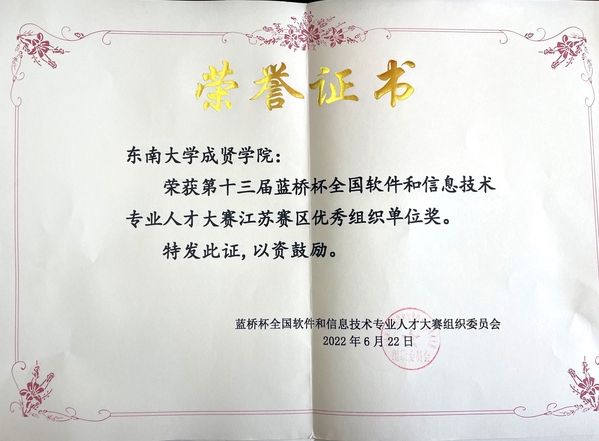 近日,第十三届蓝桥杯全国软件和信息技术专业人才大赛成绩揭晓,我校学子荣获全国总决赛一等奖1名、三等奖1名、优秀奖3名。江苏省赛一等奖7名、二等奖29名、三等奖45名。bat365中文官方网站荣获第十三届蓝桥杯全国软件和信息技术专业人才大赛江苏赛区优秀组织单位奖和优胜学校奖。