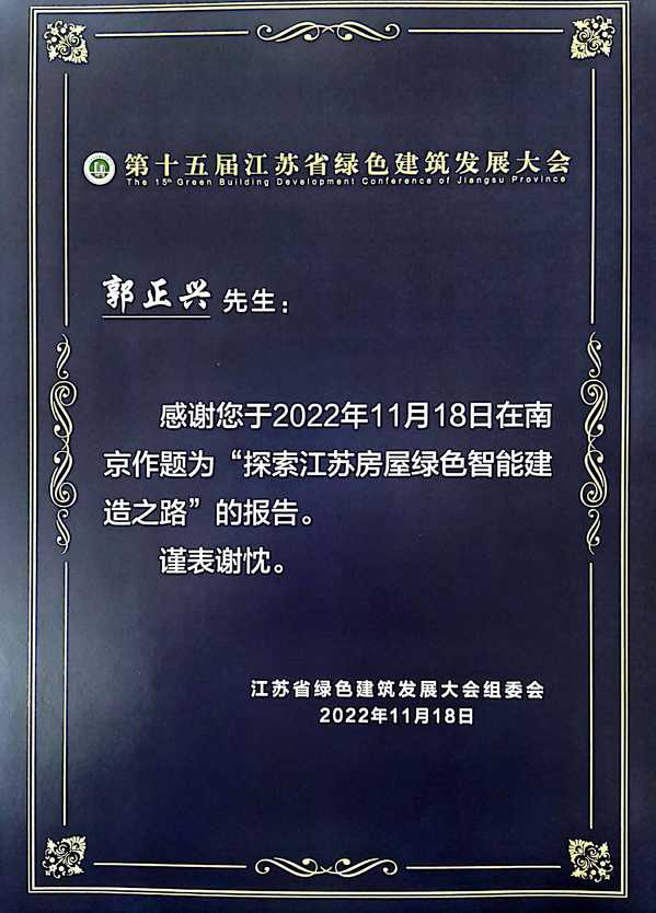 11月17日,第十五届江苏省绿色建筑发展大会在南京召开,土木与交通工程学院院长郭正兴教授代表bat365中文官方网站参加本次大会并作专题报告。