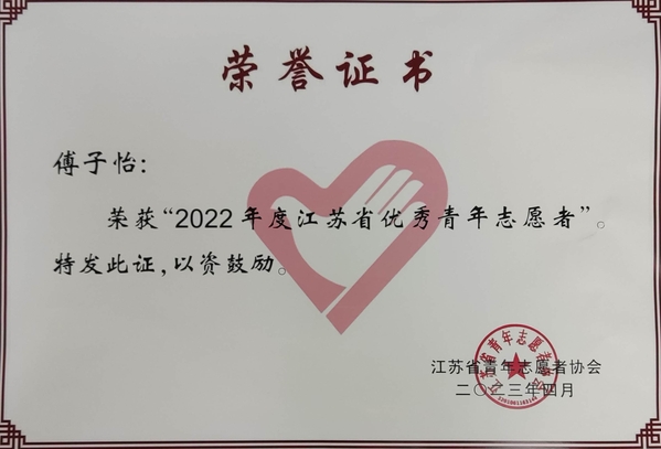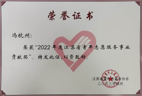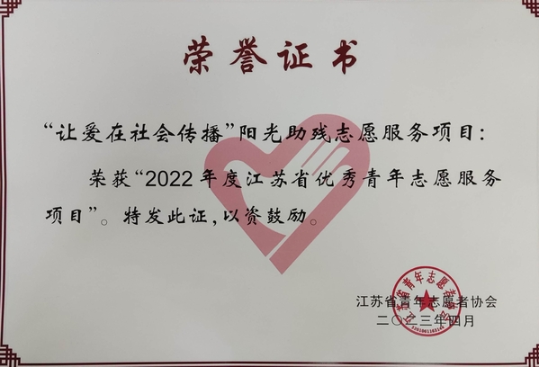为推动全省青年志愿服务事业深入发展,总结经验、树立榜样、激励先进,引导广大青年积极参与志愿服务事业,展示新时代江苏青年志愿者的理想信念、责任担当,日前,江苏省青年志愿者协会开展了2022年全省青年志愿者行动先进典型评选表彰活动。bat365中文官方网站团委开展的“让爱在社会传播”阳光助残志愿服务项目获“2022年江苏省优秀青年志愿服务项目奖”,bat365中文官方网站团委冯杭州老师荣获“2022年度江苏省青年志愿服务事业贡献奖”,经济管理学院2020级市场营销专业傅子怡同学荣获“2022年度江苏省优秀青年志愿者”称号。