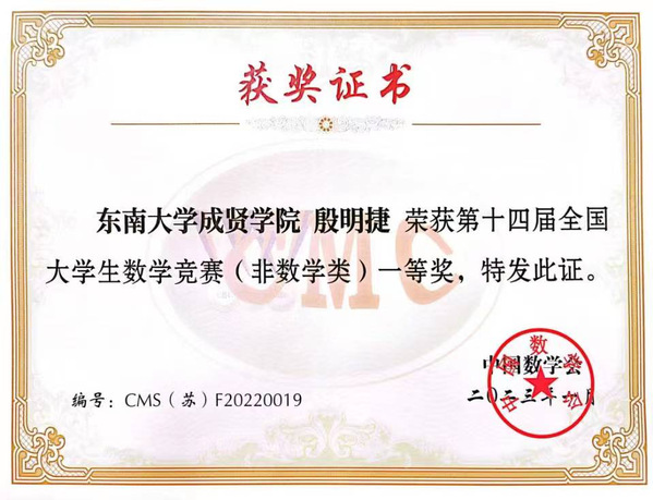 全国大学生数学竞赛是一项面向本科生的全国性高水平学科竞赛,是青年学子展示数学基本功和数学思维的舞台,也是对学校数学教学水平的检验。本次竞赛全国共有32个赛区231769人报名参加初赛,从中选拔出了922人进入决赛,实际参赛人数905人,其中数学专业组461人,非数学专业组444人。我校19级软件工程2班的殷明捷同学在江苏赛区非数学专业组中以第19名的好成绩挺进决赛。决赛中他与来自北京大学、清华大学、复旦大学、中国科学技术大学和南京大学等高校的学生同场竞技,最终获得全国非数学类三等奖。