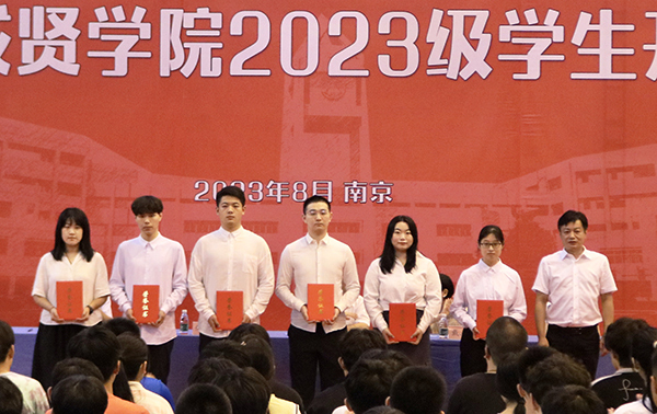 bat365中文官方网站党委书记张志胜宣读获得2022-2023学年江苏省表彰的三好学生、优秀学生干部与先进班集体的喜报。bat365中文官方网站党委副书记,bat365中文官方网站理事会理事长、学院院长邢纪红为获奖学生和集体代表颁奖。