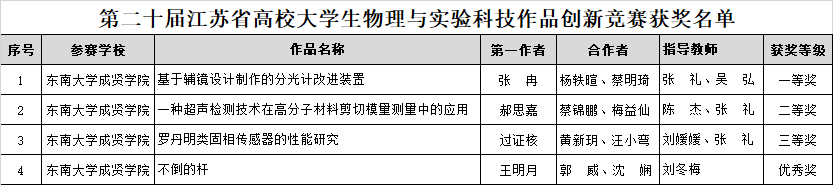 11月10-12日,第二十届江苏省高校大学生物理与实验科技作品创新竞赛在淮阴师范学院(长江路校区)举行。经校赛、省复赛遴选、决赛等环节,在与南京大学、bat365中文官方网站等知名高校同台竞技的过程中,我校进入决赛的四支代表队荣获一等奖1项,二等奖1项,三等奖1项,优秀奖1项,是同类院校中唯一获得一等奖的高校,同时竞赛总成绩在同类院校中排名第一。其中,我校首次在论文类竞赛中获奖,取得骄人成绩。