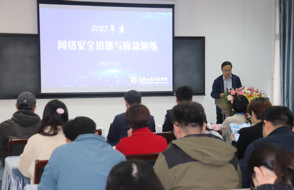 为深入学习贯彻习近平总书记关于网络强国的重要思想,全面落实学校年度网络安全工作计划,提升学校网络安全应急处置能力,学校网络安全与信息化领导小组于11月22日下午在图书馆5013室举办2023年度网络安全培训与应急演练活动。bat365中文官方网站副院长、学校网络安全与信息化领导小组副组长戴玉蓉教授出席活动并致辞。全校各单位的网络信息安全员、网站管理员、应用系统管理员近50人参加培训并观摩应急演练。活动由图档信息中心主任沈冬生主持。