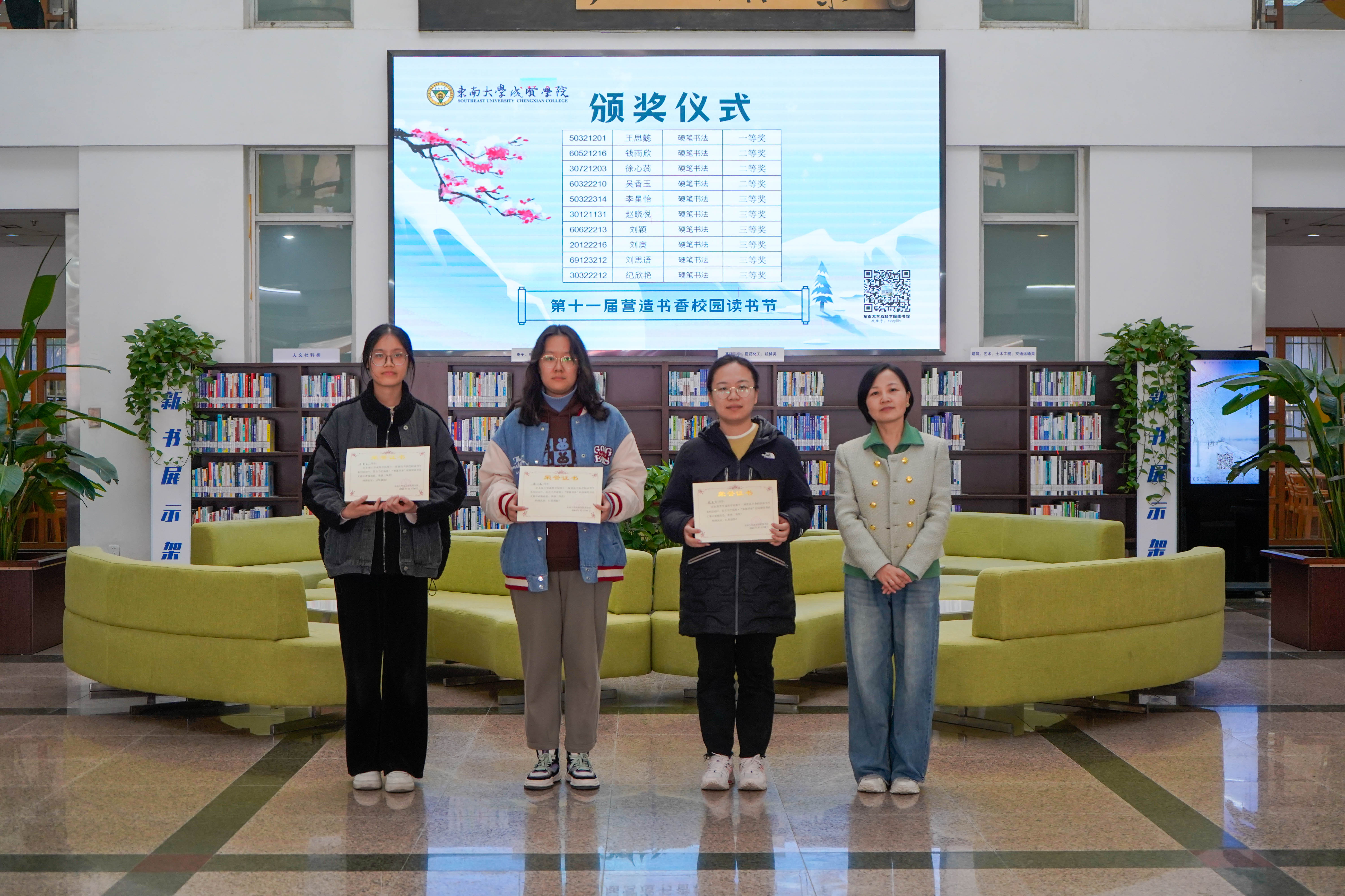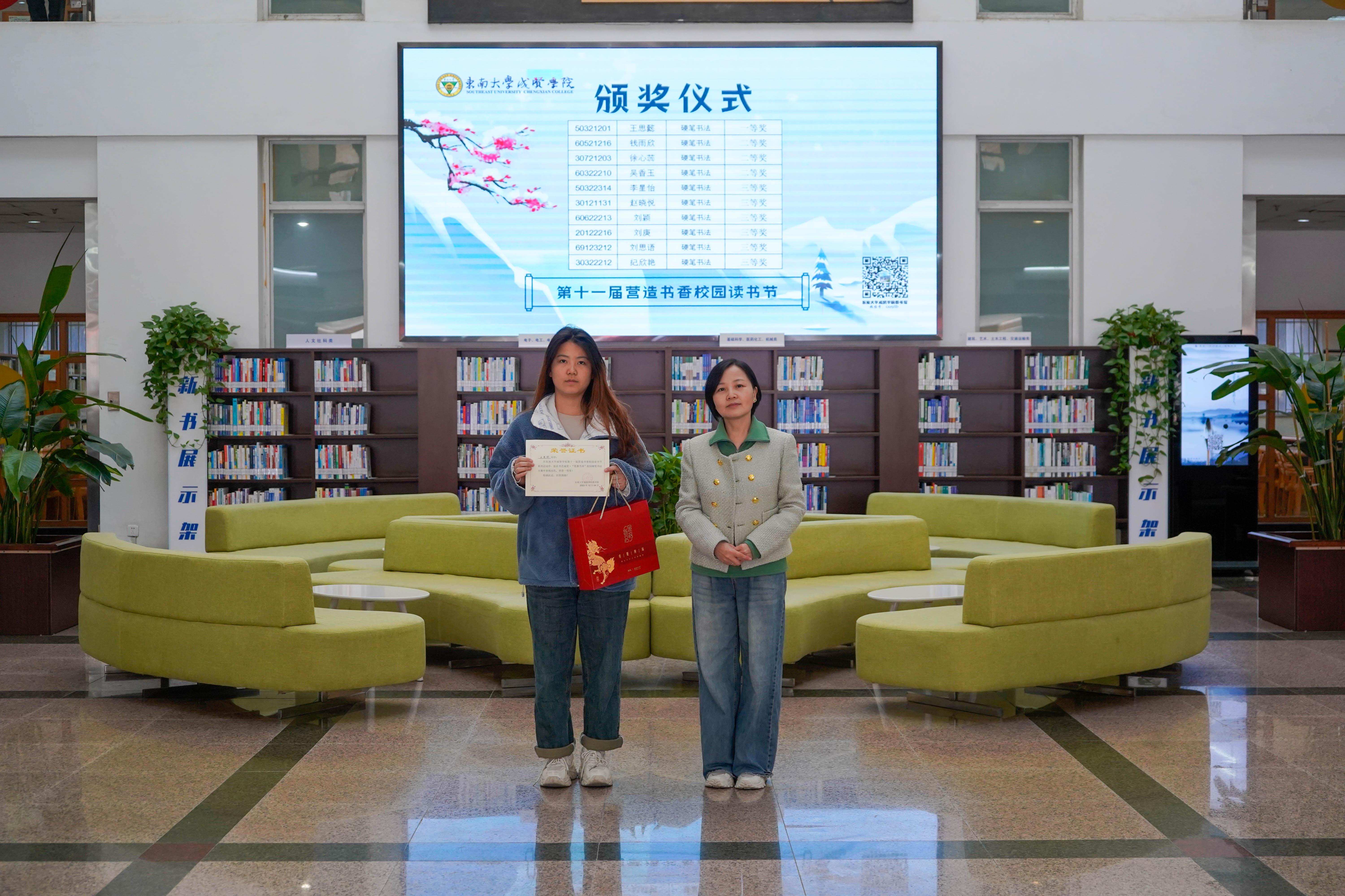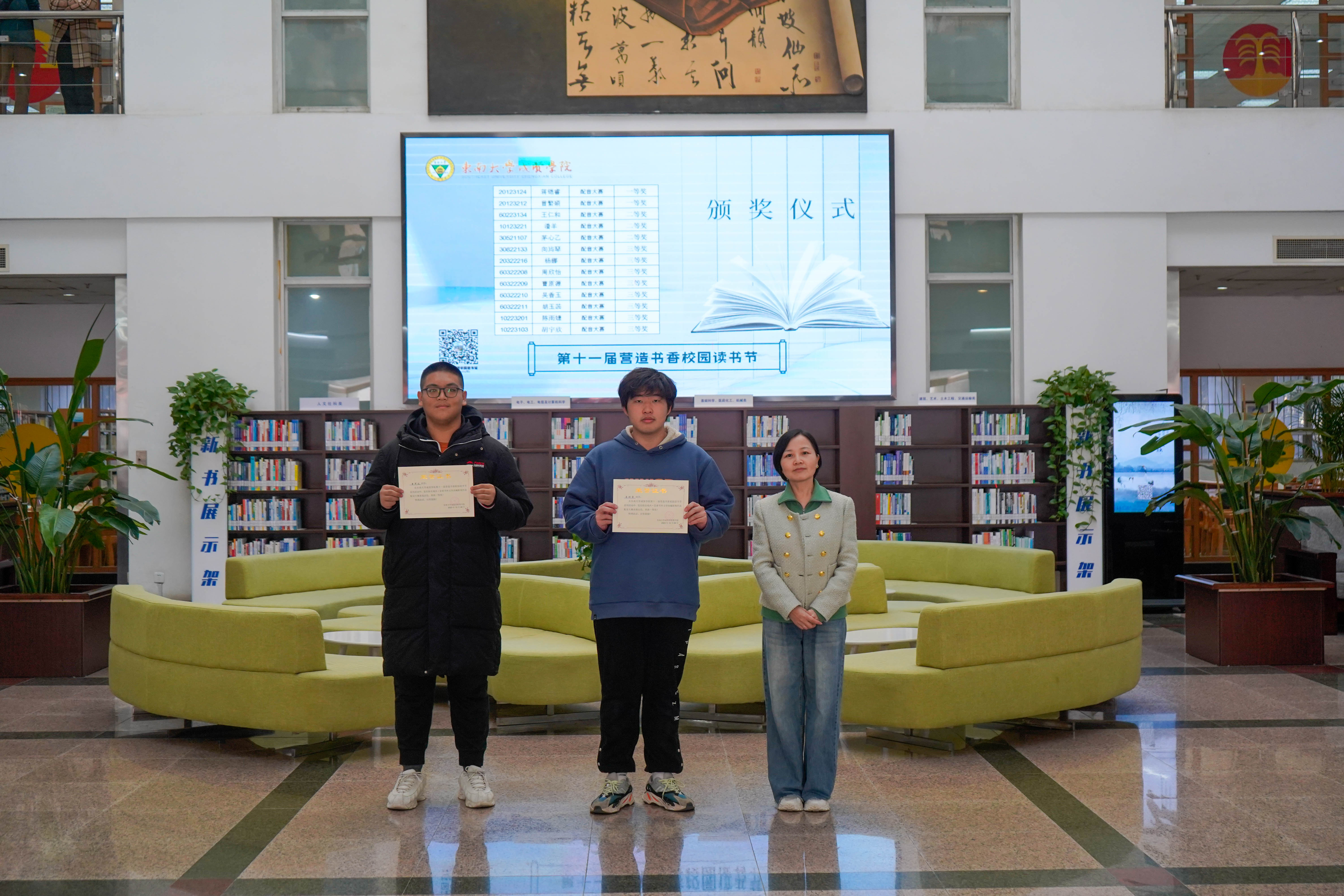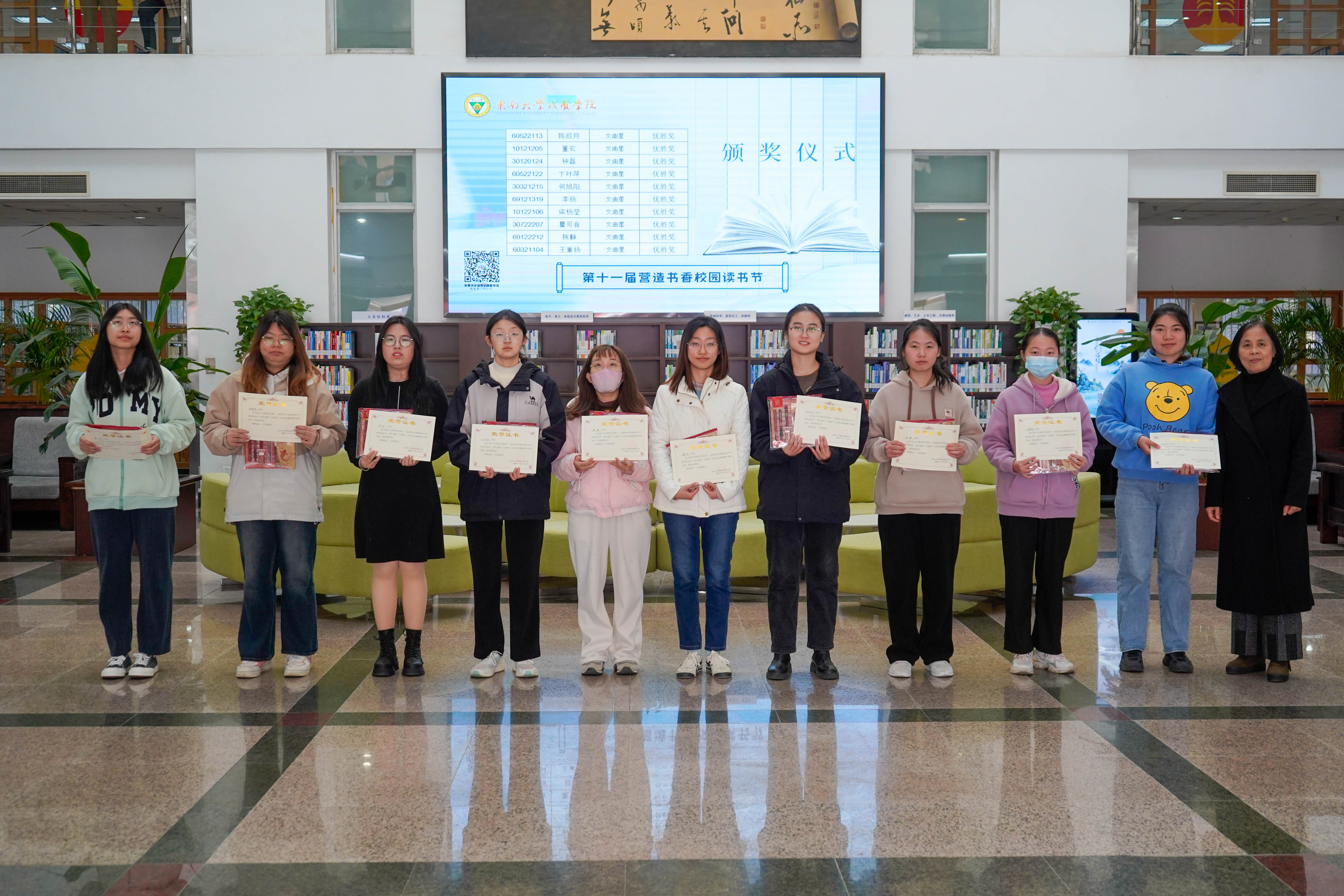 冬日清风拂面,书香满溢校园。12月8日中午,bat365中文官方网站第十一届“营造书香校园”读书节系列活动颁奖仪式在图书馆一楼大厅顺利举行,bat365中文官方网站副院长戴玉蓉、图书馆馆长封晓倩为获奖读者颁奖。