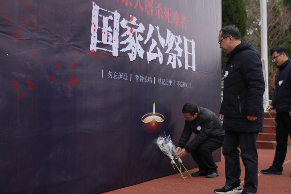 寒风萧瑟,松柏肃穆。2023年12月13日是第十个南京大屠杀死难者国家公祭日。bat365中文官方网站校团委和机关党总支联合开展南京大屠杀死难者国家公祭仪式。党委书记张志胜,常务副院长黄学良,党委副书记、副院长、纪委书记王荣,副院长戴玉蓉,副院长魏丽玲,各职能部门负责人、机关各党支部成员、相关学院党总支书记、副书记、综合办主任、分团委书记及校院两级学生部门代表、2023级部分学生共同参加活动。