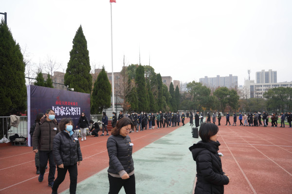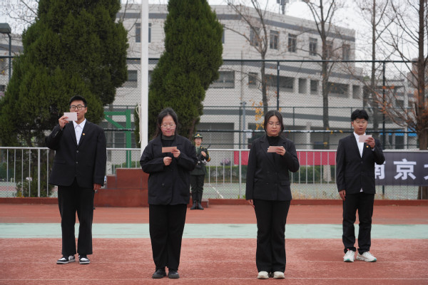 上午9时59分,悼念仪式正式开始。10时01分,凄厉的警报声穿越城市上空,时间在这一刻凝固,全体师生集体静默。山河共呜咽,寰宇同悲戚,86年前的今天,侵华日军侵入南京,制造了惨绝人寰的大屠杀。“1937.12.13”,这个满含伤痛和血泪的日子,承载着一个民族刻骨铭心的记忆;“300000”,这个用皑皑白骨垒成的数字,记载着中国人永志不忘的伤痛。随后,师生代表依次献上菊花,愿逝者安息,生者缅怀,致敬革命先烈,感怀国家之殇。活动最后,校团委宣传部广播台学生代表齐声朗诵《和平宣言》,发出庄严的和平誓言,铿锵有力,声声入耳。